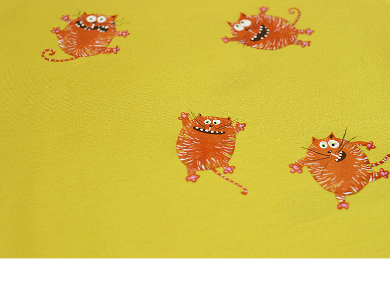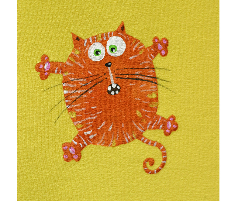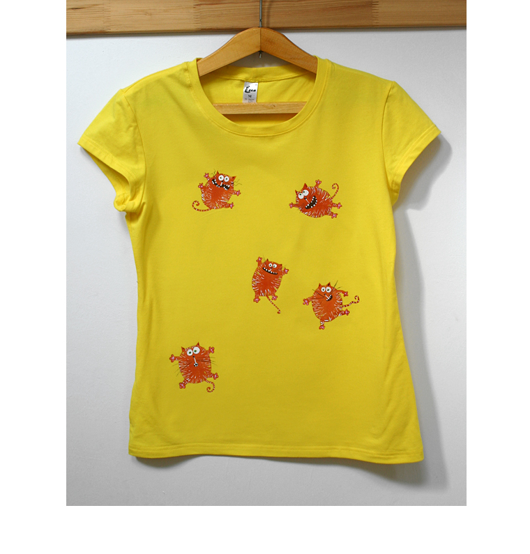 Tai pirmieji marškinėliai, kuriuos pardaviau Ebay. Juos kūriau norėdama išbandyti draugės Linos įmonės (www.lega.lt) siūdinamus marškinėlius. 5 nedidelius linksmus katinėlius piešiau kempinėle ir teptuku su tekstiliniais dažais. Medžiaga labai tiko pasirinktai technikai ir rezultatas gavosi toks puikus, kad nutariau smalsumo dėlei įkelti į www.e-bay.com Parduoti pavyko! Marškinėliai iškeliavo į Angliją.