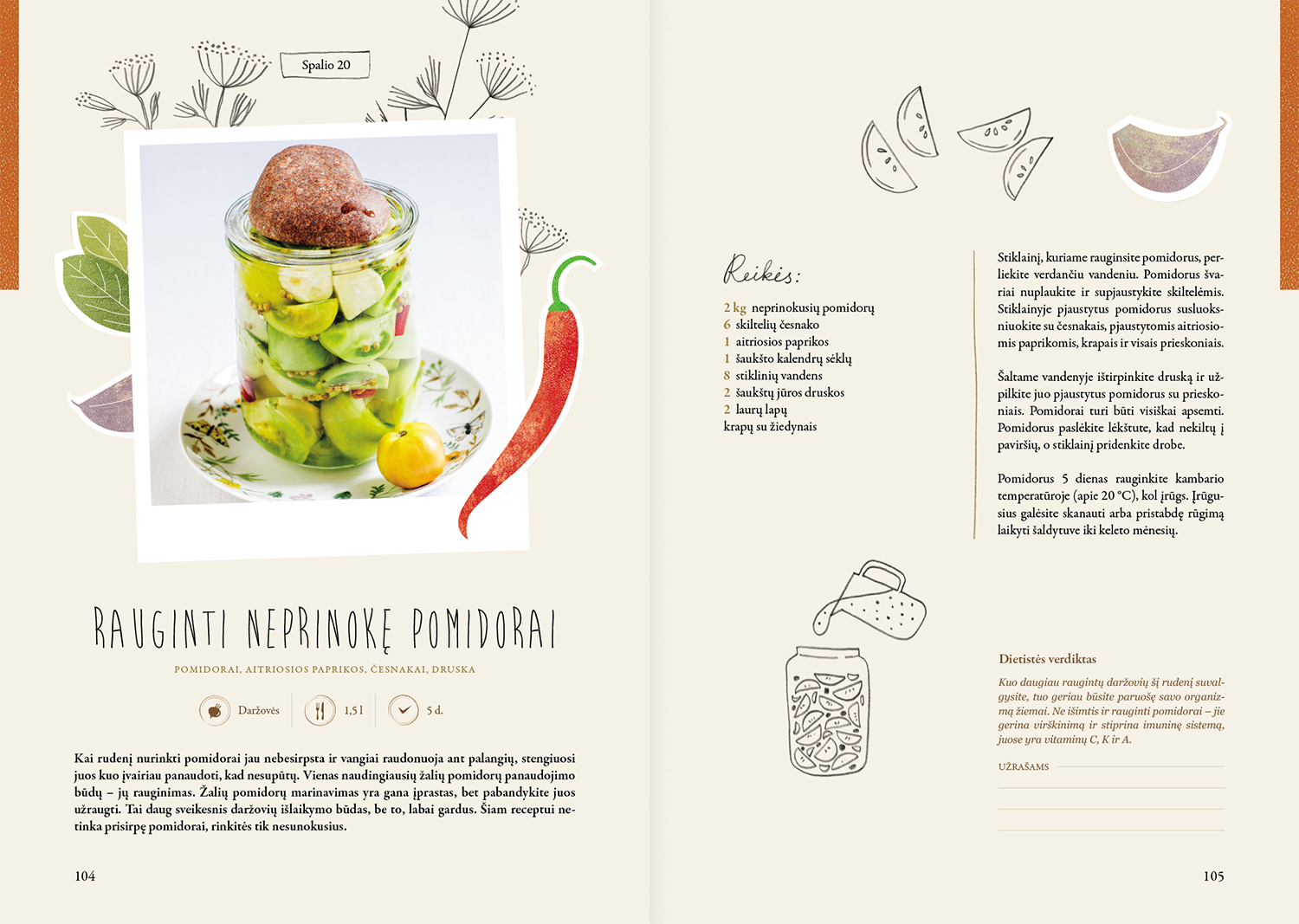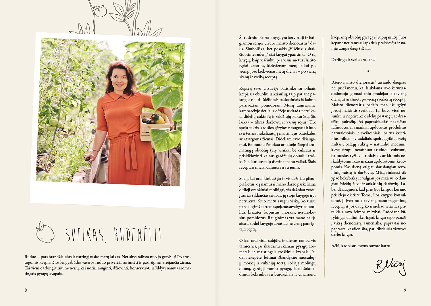 Baigiamoji, paskutinė „Gero maisto dienoraštis” serijos knyga skirta rudeniui. Per metus išleisti 4 knygas buvo tikra iššūkis. Sunkiais momentais viena kitą paragindamos, džiugiais momentais viena kitą palaikydamos ir pasidžiaugdamos paskutiniąją rudens knygą baigėme šiek tiek pavargusios nuo tempo, tačiau su tokiu pačiu įkvėpimu, entuziazmu ir atsakomybe padaryti viską kuo geriausiai. Turint rankose 4 knygas, abejonių nekyla – padirbėta iš peties, padirbėta su MEILE!