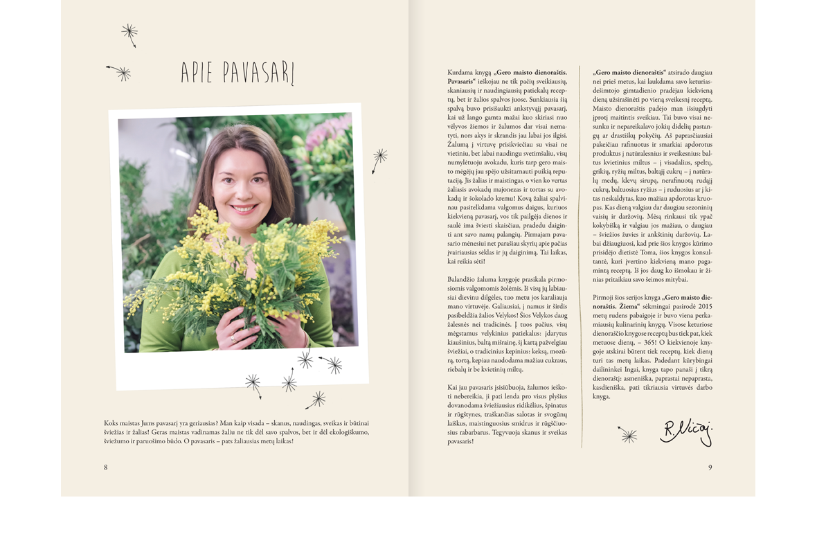 „Gero maisto dienoraštis. Pavasaris“ tai antroji knygų serijos „Gero maisto dienoraštis“ knyga (pirmoji buvo skirta žiemos sezonui). Knyga pilna pavasarinės žalumos, gaivaus vėjuko, skani ir kvepianti. Kuriant šios serijos knygas – tikras iššūkis iš anksto prisišaukti laukiamą metų laiką. Spalį mintimis gyvenau žiemoje, sausį į širdį įsileidau pavasarį. Kovo pabaigoje jau pradėsiu gyventi vasaros jausmu. „Gero maisto dienoraštis. Pavasaris“ rezultatu labai džiaugiuosi ir didžiuojuosi.