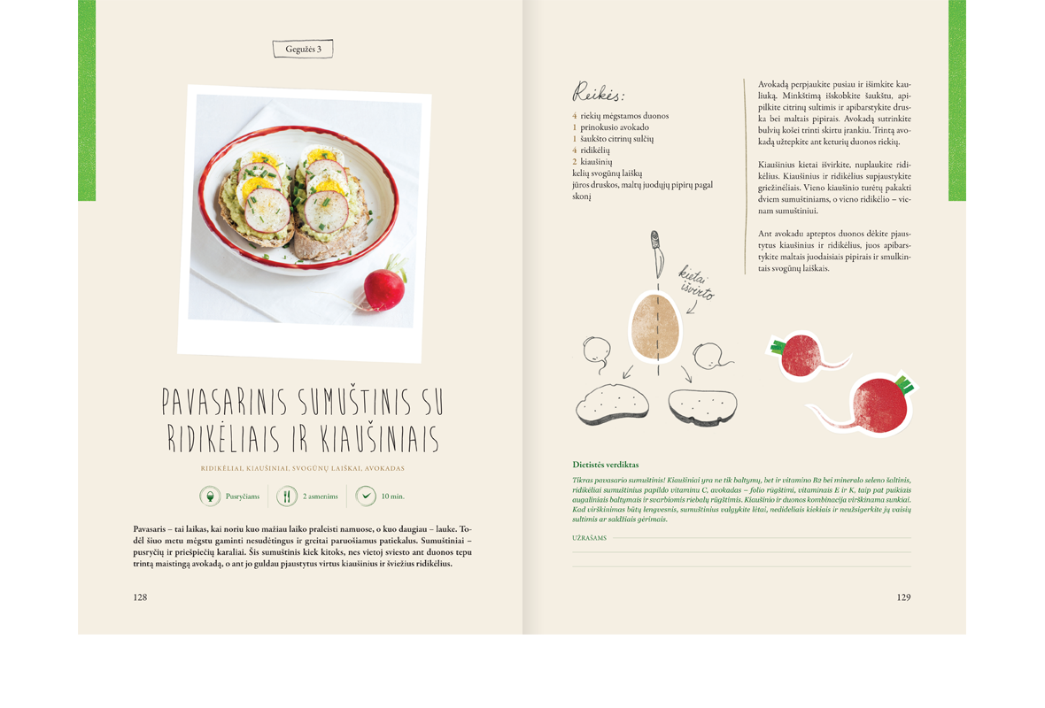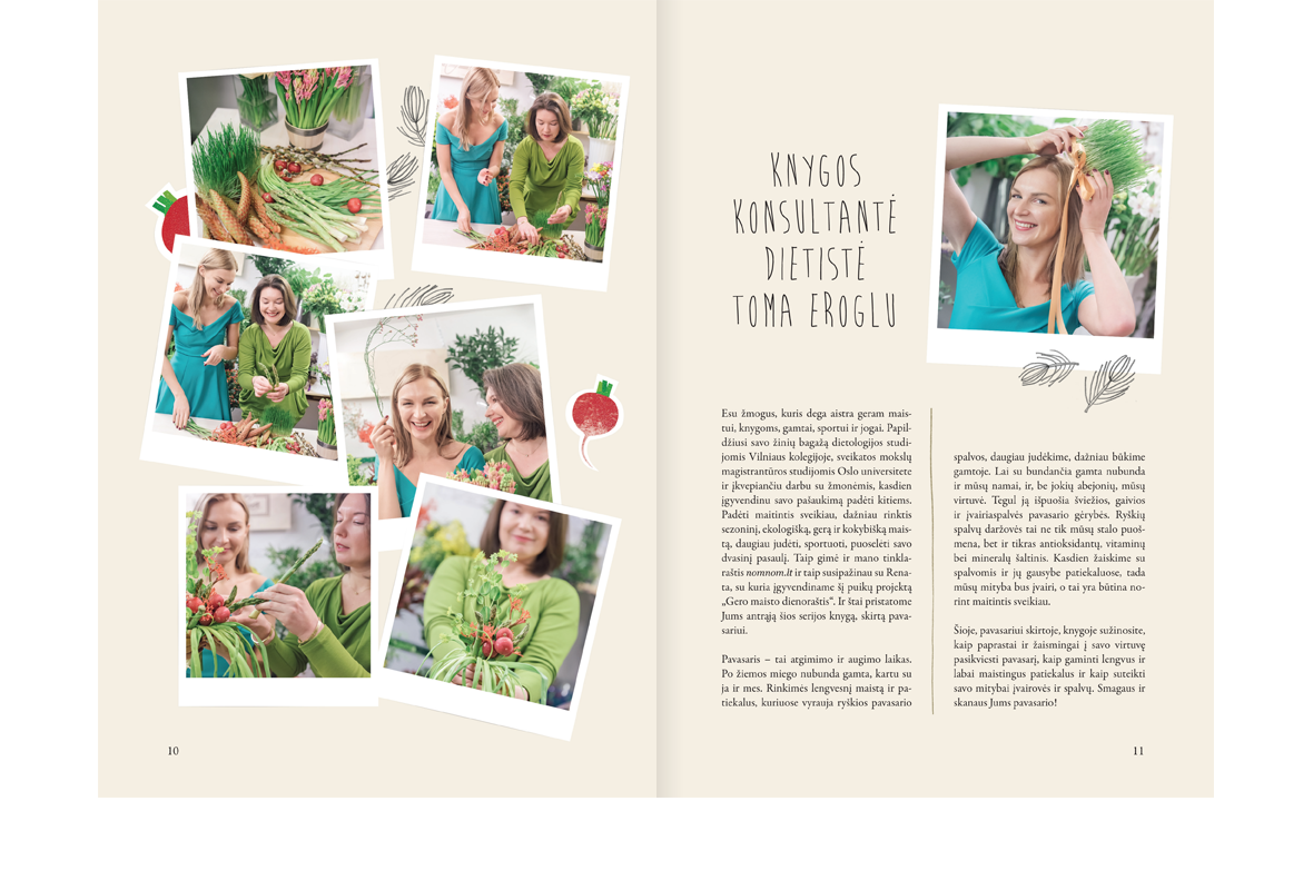 „The book should be appealing to those who are looking for a healthy way to eat in spring. There are loads of seasonal recipes with different sprouts, edible nettles, spring radish, asparagus and rhubarb. A lot of attention is dedicated to healthy Easter dishes like easy eggs and meat courses, festive sweets without flour and sugar.”