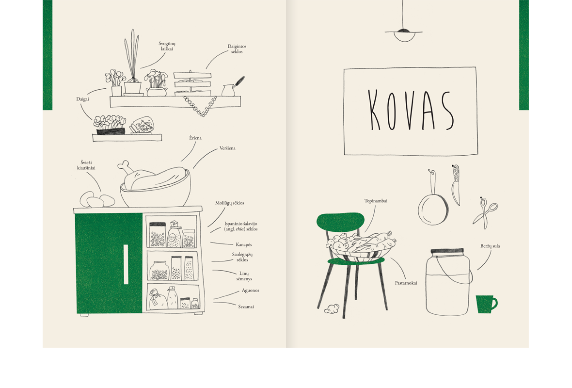 Each month in the book has its own individual shade of color and a special illustration. The cover is very soft and mild, gentle to touch and easy to carry. The diary feel is very strong throughout the entire book: the recipes were photographed in home environment and it almost seems like the photographs came from a personal sketch-book, each page has unique linear colored and black and white illustrations. After every recipe some space is left for the reader‘s personal notes which can be written with a simple pencil. The disliked spice can be easily crossed out and replaced with a different one and it will perfectly fit the style of the book. The book was created to be personal for every reader.