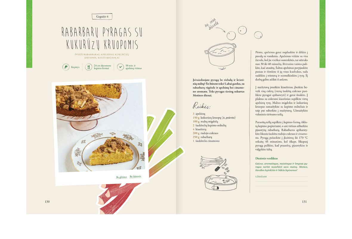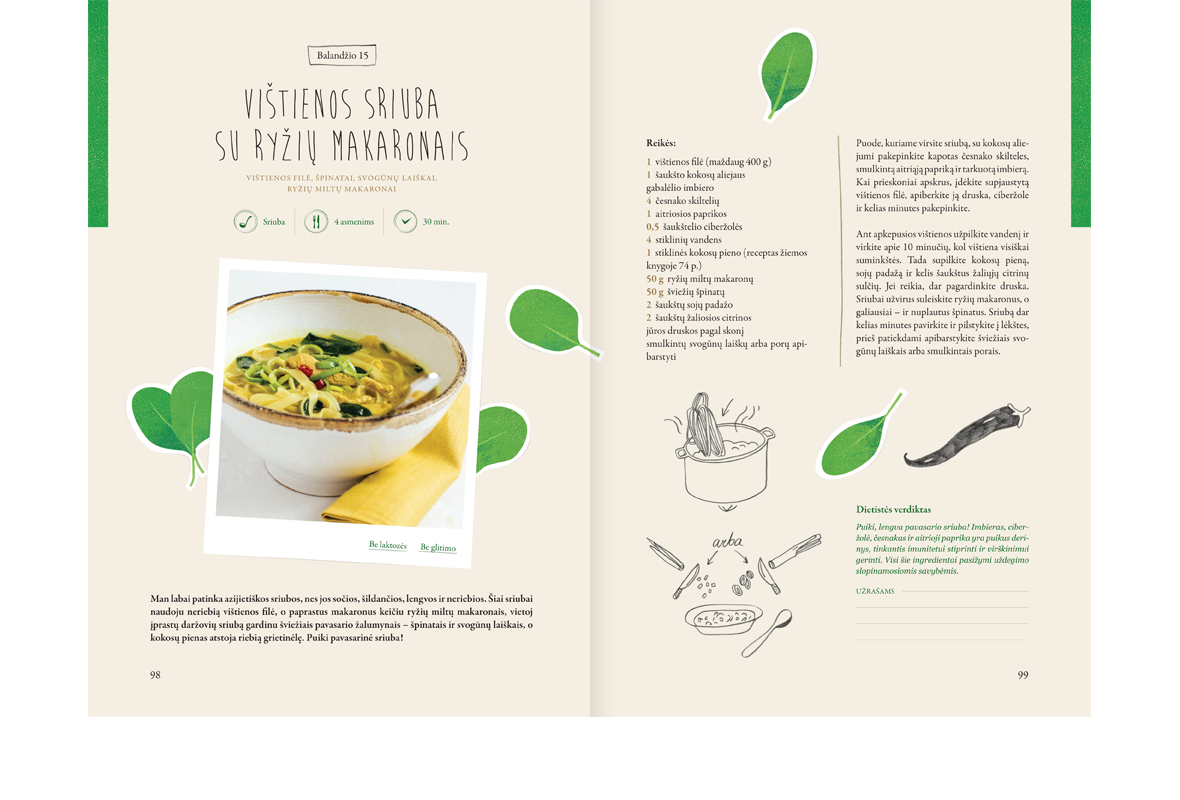 Kiekvienas knygos mėnesis turi individualų pagrindinės sezono spalvos atspalvį, bei specialiai tam mėnesiui sukurtą įvadinę iliustraciją. Pusiau minkštas ir švelnus knygos viršelis yra labai malonus liesti bei patogus nešiotis ir dažnai vartyti. Knygos dizaine išryškinamas dienoraščio pojūtis: receptai fotografuoti namų aplinkoje, nuotraukos pateikiamos lengva forma, lyg pažertos iš asmeninio albumo, kiekvienam puslapiui sukurtos unikalios linijinės nespalvotos ir spalvotos iliustracijos, po kiekvienu receptu yra palikta vietos skaitytojo užrašams, knygos popierius leidžia lengvai rašyti net paprastu pieštuku. Galima drąsiai išbraukti nemėgiamą prieskonį, užrašyti komentarą ir tai puikiai derės su pieštomis iliustracijomis. Knyga sukurta taip, kad taptų kiekvienam asmeniška.