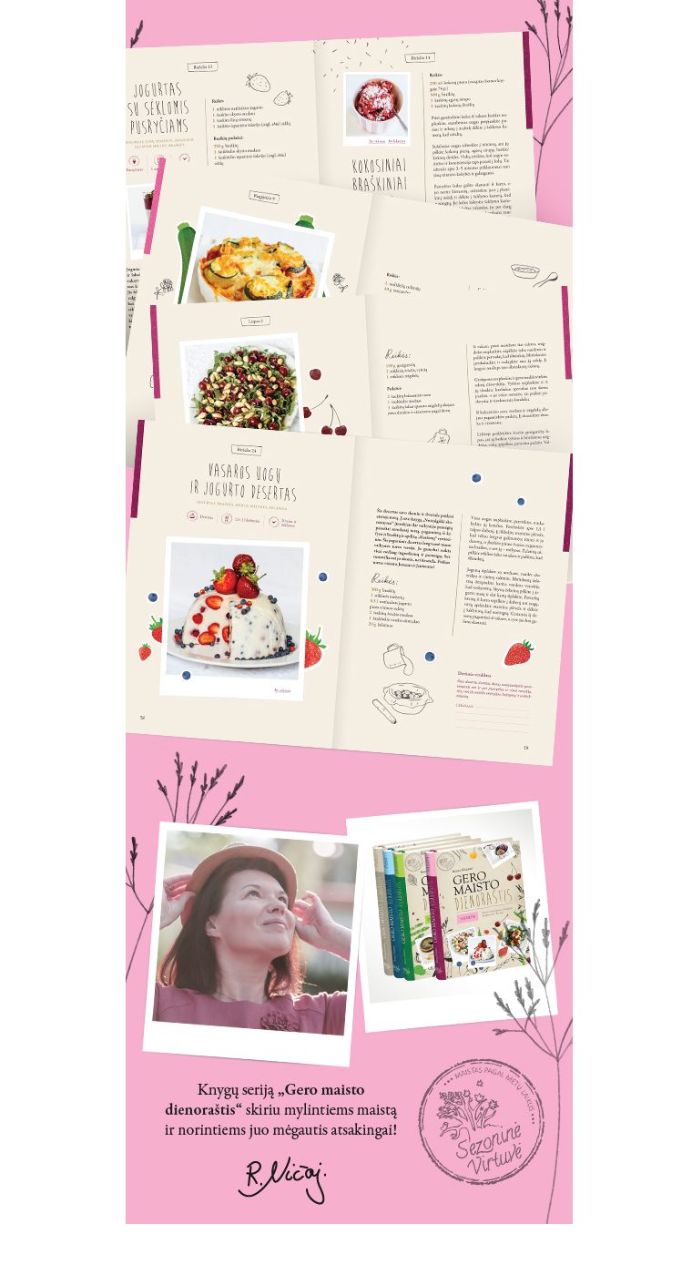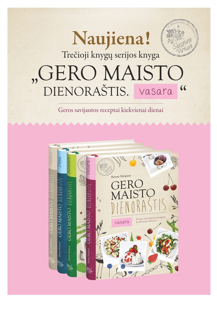 Knygų serija „Gero maisto dienoraštis“ sugulė į keturias, skirtingiems metų laikams skirtas knygas. Tai dienoraščio forma parašytos kulinarinės knygos, kiekvienai metų dienai jose rasite po vieną ne tik skanų, bet ir sveiką receptą. Iš viso dienoraštyje 365 receptai, tiek pat, kiek metuose dienų. Po kiekvienu receptu skaitykite dietistės komentarą, kuris patvirtins patiekalo naudingumą. Receptai labai paprastai, lengvai ir greitai pagaminami, po jais tokie ženkleliai: „Be cukraus“, „Be glitimo“, „Be laktozės“.