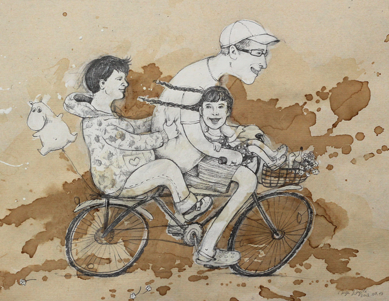 Piešinys puikiai šeimai, smagiems draugams, geriems kaimynams Kaleckams jungtinio gimtadienio proga. Piešta akriliniais dažais, kava ir pieštuku ant rudo popieriaus.
