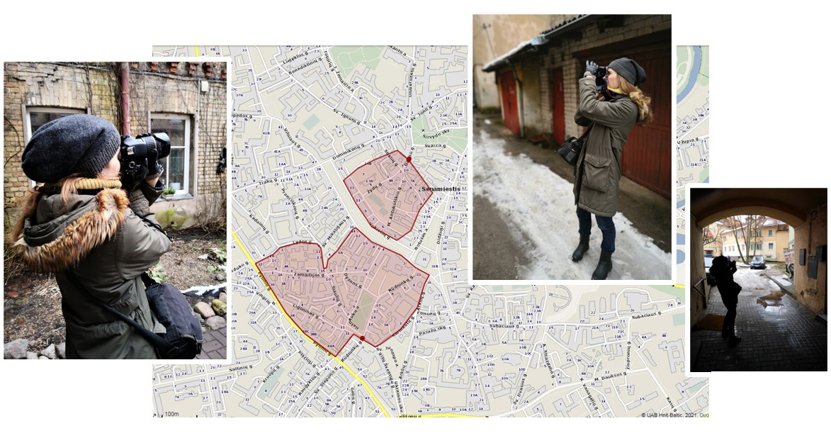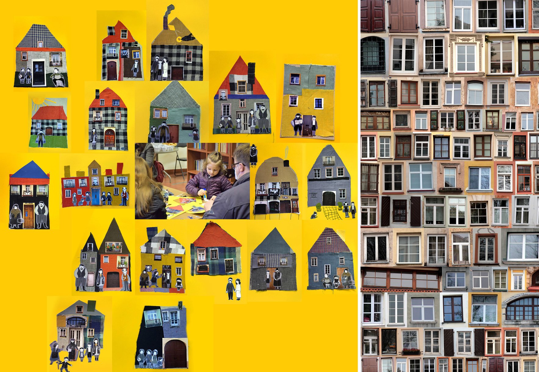 For the workshop I came to the idea to create a city of freedom, to build new houses, to remember and honor those who lived in the ghetto. I decided to use the photographs if the windows, balconies and doors of the houses in the Ghetto as one of the materials. I went to Vilnius, defined the territory of the ghetto on a map and spent the whole day walking through the streets, yards and taking pictures. The other materials are very simple: yellow paper for the background, smaller size craft paper for creating a shape of the houses and linen fabrics to decorate it. I wanted to use simple materials that a child living in the ghetto would find. Materials presented for the workshop, especially photographs, connect the historical events and the present. The participant touches deeper the story and the past.