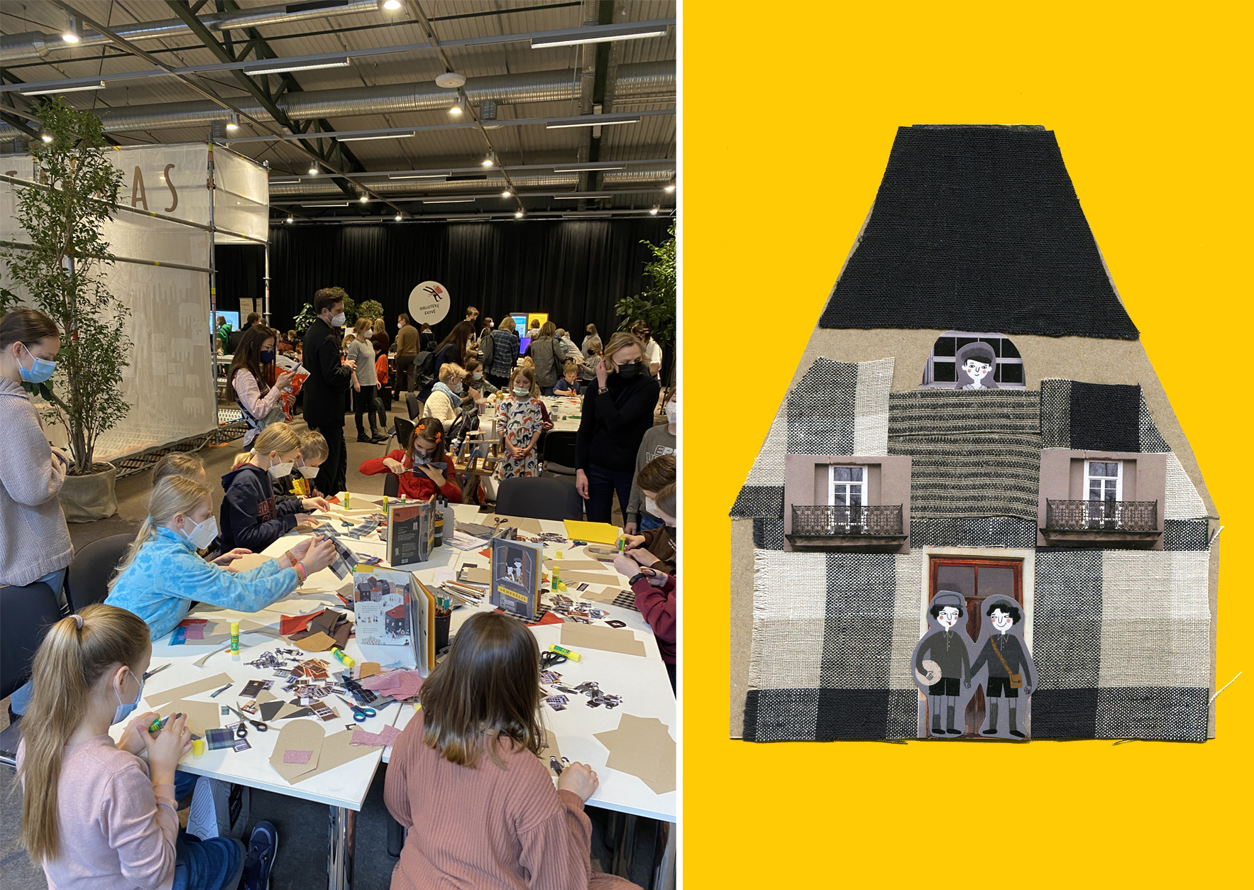 Before the workshop usually a talk about the city within the city (the ghetto area, life in the ghetto) and the process of creating the book. The story is illustrated with maps, photographs from Kaunas, Vilnius and other ghettos, sketches of illustrations and other visual material that reveals the behind-the-scenes of illustration.