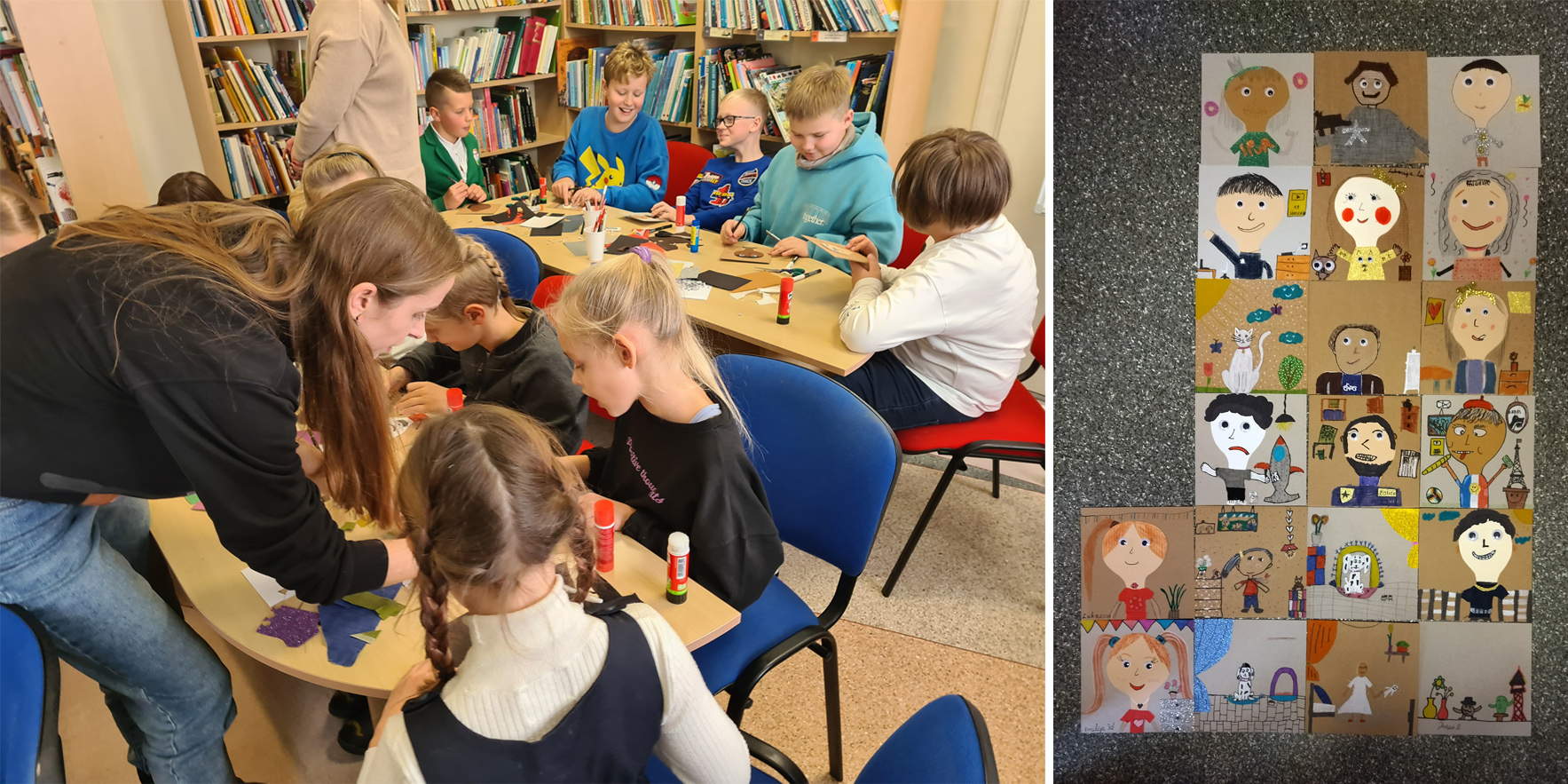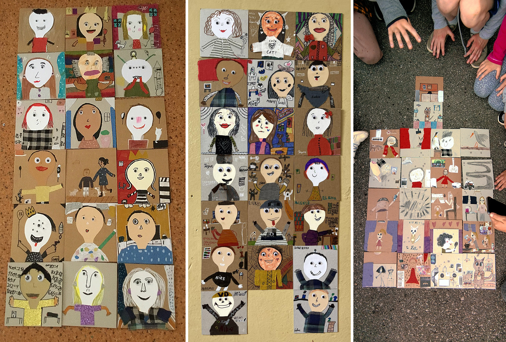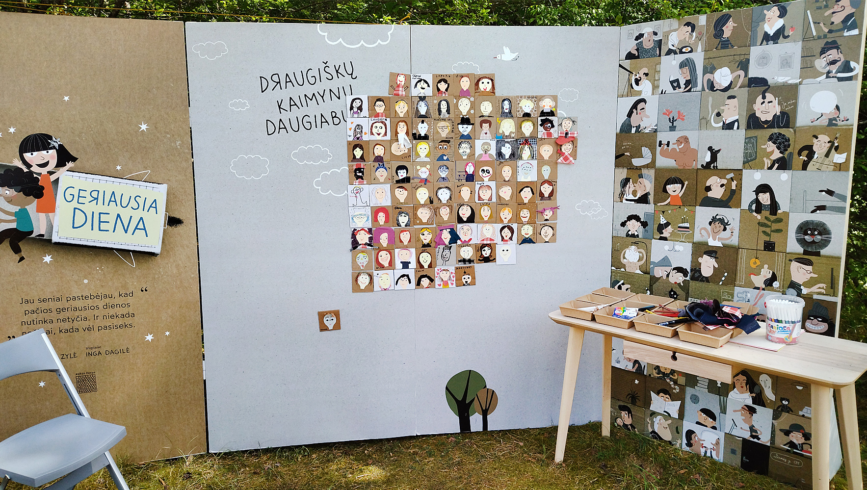 This educational workshop is based on the book „The Best Day Ever” written by Kotryna Zylė and illustrated by me. After meeting the children, I tell them about the creation of this book, show them the visual material of how I created the illustrations, the unconventional techniques I used, talk to them about what the best day is and how it can happen every day, what kind of people we are surrounded by, do we know, how different we are, and how sometimes the first impression can be deceiving. During the workshop, we „build” the group’s apartment block (the main setting of the book’s story, where bonds grow, friendships form and the best days happen). Each child uses collage techniques to create the interior of his/her own apartment and places him/herself (or whatever he/she decides) in it. The base of the flat is ~15×15 cm cardboard, while paper, linen and other materials are used to create the interior or portrait. The choice of technique (gluing or drawing) makes the workshop accessible to children of all ages and abilities. At the end of the workshop, all the flats „inhabited” by the children are placed side by side and photographed as one big apartment block.