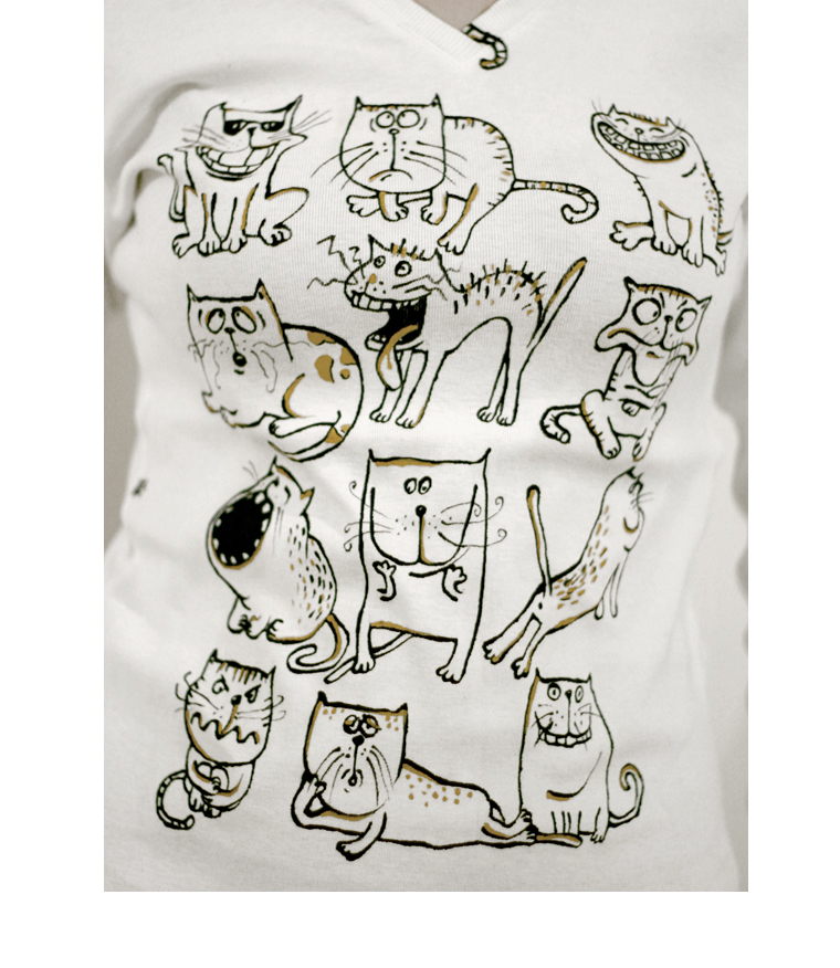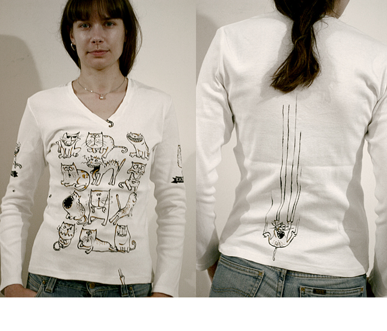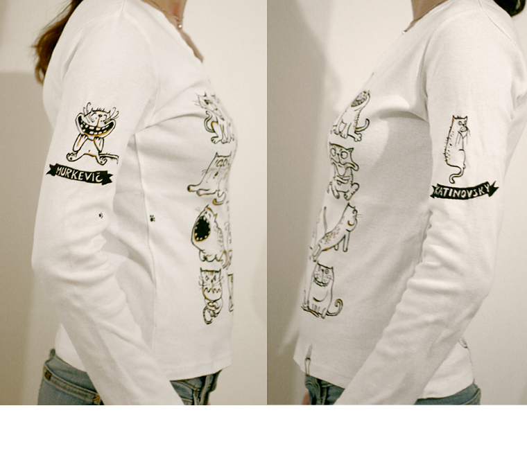 Tai pirmieji mano piešti marškinėliai. Nuo jų prasidėjo linksmų, katiniškos tematikos marškinėlių era. Nors pirmi blynai dažnai privyla, gautu rezultatu aš labai didžiavausi ir iki šiol gėriuosi. Marškinėlius piešiau sesei Laurai, teptuku su 2 spalvom tekstilinių dažų. Tuo laikotarpiu savo katinams buvau sugalvojusi vardus, tiksiau pavardes, kad rimčiau skambėtų -Murkevič ir Katinovsky. Kodėl lenkiškos? Nežinau..