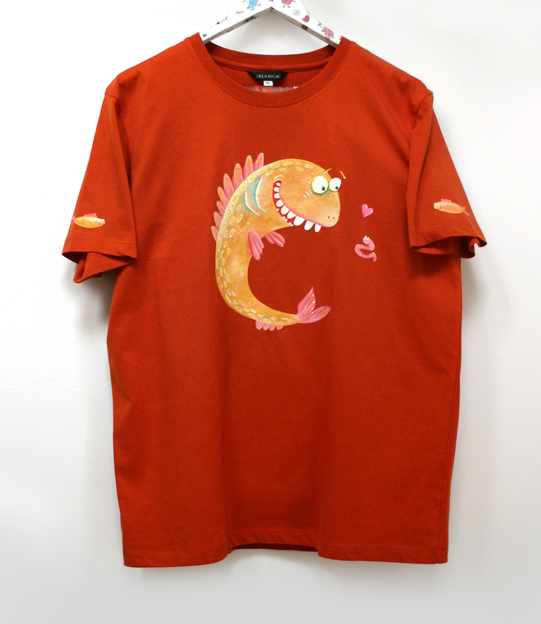 Marškinėliai su meilės iš pirmo žvilgsnio tarp lydekos ir slieko įsižiebimo akimirka – tai dovana gimtadienio proga užkietėjusiam žvejui, beveik švogeriui ir šiaip liksmam žmogui Sauliui.